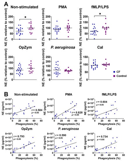 (A) Comparison of neutrophil elastase (NE) levels in non-stimulated and stimulated neutrophil cultures from children with cystic fibrosis (CF) and healthy children. NE detection was performed as described in Section 2.7. Values are given as values relative to the control (the values of NE for an individual patient or control child were divided by the mean control for that experiment). (B) Correlation of NE levels in supernatants of CF neutrophil cultures and phagocytosis. PMA—phorbol myristate acetate; fMLP/LPS-N-formyl-methionyl-leucyl-phenylalanine and lipopolysaccharide; CaI-calcium ionophore, OpZym-opsonized zymosan. * p < 0.05, compared to the corresponding controls; Student’s t-test (A) and Spearman’s rank correlation test (B).