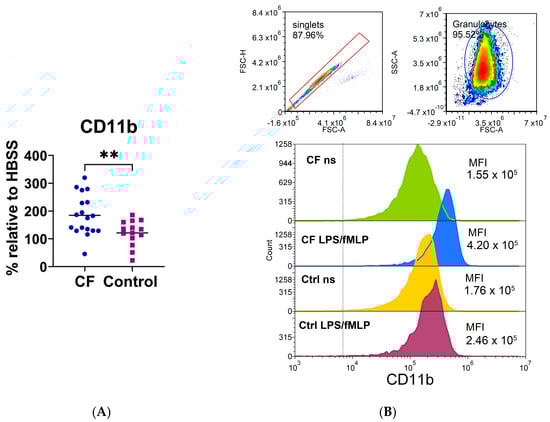 (A) The expression of CD11b on neutrophils stimulated with lipopolysaccharide and N-formyl-methionyl-leucyl-phenylalanine (LPS/fMLP). (B) A representative histogram of CD11b fluorescence. Upper part: doublet exclusion and gating strategy. Lower part: the fluorescence profile of cystic fibrosis (CF) and control (Ctrl) neutrophils; non-stimulated (ns) or LPS-/fMLP-stimulated cells. MFI—mean fluorescence intensity; ** p < 0.01, compared to the control. Results are presented as the percentage change in mean MFI of stimulated neutrophils compared to non-stimulated cells (basal fluorescence of neutrophils in HBSS medium); Student’s t-test.