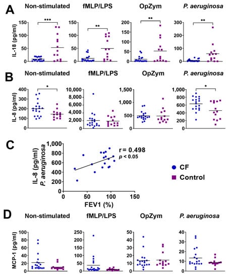 The levels of pro-inflammatory cytokines and chemokines, including IL-8, IL-18, and MCP-1, were analyzed in the culture supernatants of neutrophils because other cytokines, such as IL-1β and Interferon-α (IFN-α), IL-6, TNF-α, IFN-γ, IL-33, and IL-23), were undetectable. Both non-stimulated (p < 0.005) and stimulated (fMLP/LPS, OpZym, P. aeruginosa ) (p < 0.01) neutrophils in children with CF produced significantly lesser amounts of IL-18 than those of the control neutrophils (Figure 7A). In contrast, unstimulated and P. Aeruginosa-stimulated CF neutrophils produced higher levels of IL-8 compared to the corresponding cultures of control neutrophils from healthy children (p < 0.05) (Figure 7B). There was a positive correlation (r = 0.498, p < 0.05) between the levels of IL-8 in the CF neutrophil culture stimulated with P. aeruginosa and FEV1 in CF patients (Figure 7C). The correlation was not observed with other stimuli. The levels of MCP-1 did not show statistically significant differences (Figure 7D).