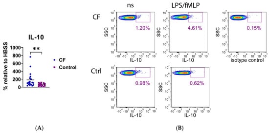 (A) Intracellular expression of IL-10 in neutrophils stimulated with lipopolysaccharide and N-formyl-methionyl-leucyl-phenylalanine (LPS/fMLP). Results are presented as the percentage change in mean fluorescence intensity (MFI) of stimulated neutrophils compared to non-stimulated (ns) cells (basal fluorescence of neutrophils in HBSS medium). (B) A representative histogram of IL-10 fluorescence of CF and control (Ctrl) neutrophils. ** p < 0.01, compared to the control; Mann–Whitney U test.