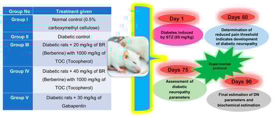 Diabetic neuropathy can be accurately diagnosed by observing a decrease in the pain threshold after 30 days of STZ treatment. To effectively test for DN, an experimental mixture containing Berberine and Tocopherol was orally administered to subjects. Specifically, two distinct doses of BR (20 mg/kg and 40 mg/kg) were supplemented with TOC at a dose of 1000 mg/kg. Treatment began on day 60 after the onset of DN resulting from STZ induction and lasted until day 90.