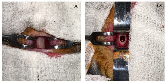 Creation of bone defect in rabbit femur: (a) intact bone; (b) created bone defect.