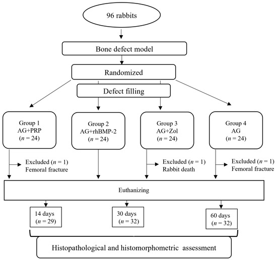 The surgical incision was closed using absorbable sutures (4-0 Vicryl, Ethicon, Johnson & Johnson, New Brunswick, NJ, USA). To prevent wound infection following surgery, the rabbits were given intramuscular injections of the antibiotic gentamicin 0.1 mL/kg (MAPICHEM, Switzerland) two times daily for three days postoperatively. Pain relief was provided by administering ketonal 0.04 mL/kg (Sandoz, Ljubljana, Slovenia). The healing process was observed daily after surgery based on a predetermined schedule for several days. At the specified time points of 14, 30, and 60 days, the rabbits were euthanized using a lethal dose of Zoletil 50 mg/mL, and the distal femur was collected for histological analysis (Figure 3). However, on the 14th day, a total of 29 rabbits (AG + PRP—7; AG + rhBMP-2—8; AG + Zol—7; AG—7) were sacrificed because 3 animals were excluded from the experiment. Furthermore, 8 rabbits from each group at each time interval (32 rabbits on the 30 days post surgery and 32 rabbits on the 60th days post surgery) completed the experiment.