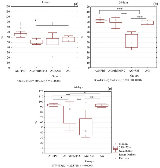 Index of bone defect closure (%) in femoral defects: (a) 14 days; (b) 30 days; (c) 60 days. AG + PRP, bone allograft with platelet-rich plasma; AG + rhBMP-2, bone allograft with recombinant human bone morphogenetic protein-2; AG + Zol, bone allograft with zoledronic acid; AG, bone allograft. (* p < 0.05; ** p < 0.01; *** p < 0.001).