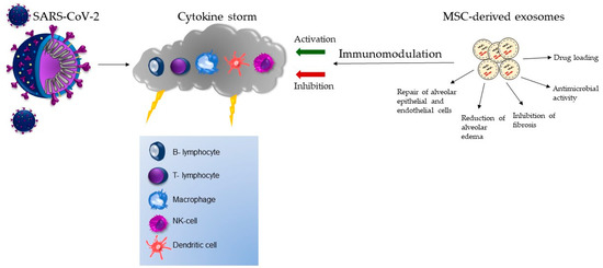 Exosomes help modulate the immune response in COVID-19, during which, the immune response can become dysregulated, leading to excessive inflammation and tissue damage. MSC-derived exosomes suppress proinflammatory cytokines and promote the production of anti-inflammatory factors, thereby potentially reducing the severity of the disease [157,158].