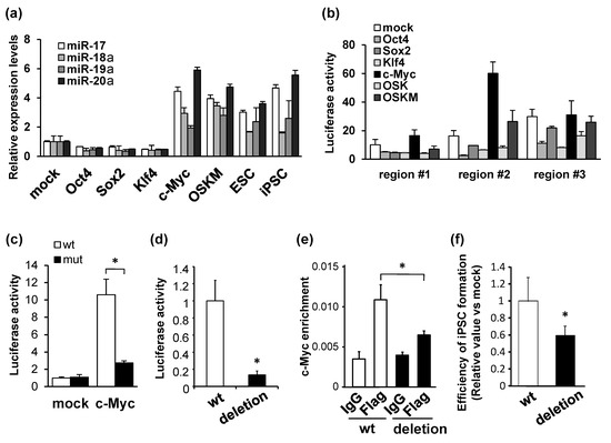 Activation of miR-17-92 transcription by c-Myc. (a) Expression levels of miR-17, miR-18a, miR-19a, and miR-20a in MEFs infected with mock or each reprogramming factor indicated. Their levels in mouse pluripotent stem cells (ESCs and iPSCs [15]) are also shown. The expression levels were normalized by values in mock-introduced MEFs. (b) Results of luciferase assays using reporters containing one of the three consecutive sections (promoters #1 to #3) in the miR-17-92 promoter region co-transfected with mock, Oct4, Sox2, Klf4, c-Myc, OSK, or OSKM in MEFs. (c) Results of the luciferase assay using reporter plasmids containing the wild-type or mutant c-Myc-binding motif of miR-17-92 promoter region #2. The reporter constructs were co-transfected with mock- or c-Myc-expression vectors into HEK 293T cells. (d) Results of the luciferase assay using reporter plasmids containing miR-17-92 promoter #2 in HEK 293T cells co-transfected with c-Myc in addition to mock or the CRISPR/Cas9 plasmid targeting the c-Myc-binding motif. (e) Quantification of DNA abundance of the miR-17-92 promoter region in wild-type (wt) or c-Myc-binding motif-deleted MEFs, treated with c-Myc-Flag x3. (f) Nanog-positive colony numbers of iPSCs reprogrammed from wt or c-Myc-binding motif-deleted MEFs. Data are shown as mean ± SD; * p < 0.05 vs. wt.