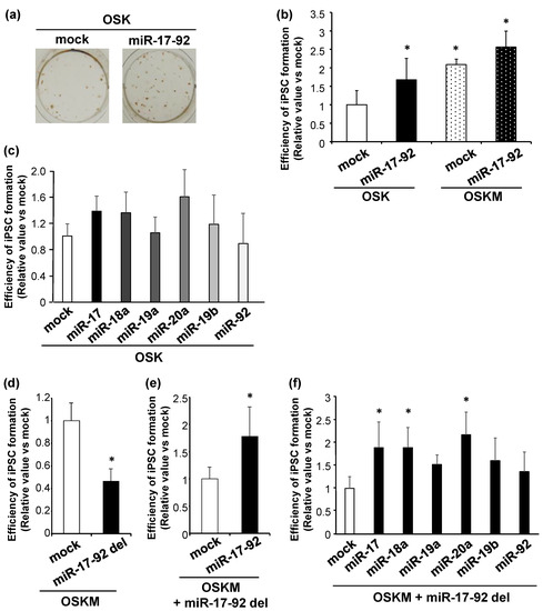 miR-17-92 is involved in efficient iPSC formation. (a) Representative images of Nanog-positive iPSC colonies induced by OSK + mock (left) or OSK + miR-17-92 (right). (b) Averaged numbers of Nanog-positive iPSC colonies reprogrammed by OSK or OSKM from MEFs co-infected with mock or miR-17-92 lentiviral vectors. * p < 0.05 vs. OSK-mock. (c) The efficiency of Nanog-positive iPSC colony production by OSK from MEFs co-infected with individual miRNAs composing miR-17-92. (d) The production efficiency of Nanog-positive iPSC colonies reprogrammed from OSKM-infected MEFs with or without miR-17-92 deletion. (e,f) The efficiency of OSKM-induced iPSC production from miR-17-92-deleted MEFs with or without lentiviral overexpression of miR-17-92 (e), miR-17, miR-18a, miR-19a, miR-19b, miR-20a, or miR-92 (f). Results were normalized by values in mock-infected OSK-reprogrammed cells. * p < 0.05 vs. OSKM-mock (d–f).