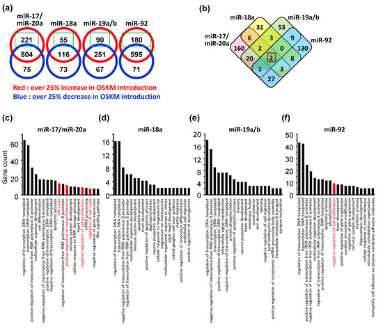 Potential targets of individual miRNAs comprising miR-17-92. (a) Numbers of predicted target genes for each individual miRNA comprising the miR-17-92 cluster with over 1.25-fold changes in OSKM-introduced MEFs. (b) Venn diagram showing the numbers of overlapped miR-17-92 target genes more than 25% upregulated by OSKM. (c–f) GO terms enriched with OSKM-upregulated genes with binding motifs of miR-17/20a (c), miR-18a (d), miR-19a/b (e), or miR-92a (f).