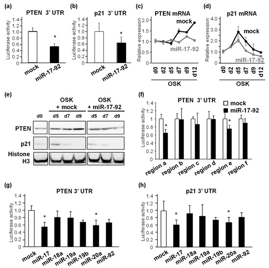 PTEN and p21 are downregulated by miR-17 and miR-20a. (a,b) Luciferase activities of the 3′ UTR reporter of PTEN (a) or p21 (b) mRNA in HEK 293T cells with or without miR-17-92 overexpression. * p < 0.05 vs. mock. (c,d) Dynamic changes in the mRNA expression levels of PTEN (c) and p21 (d) during the reprogramming process in OSK-introduced MEFs co-infected with mock or miR-17-92. (e) Protein levels of PTEN and p21 on indicated days from OSK-introduced MEFs co-infected with mock or miR-17-92. Histone H3 was used as a loading control. (f) Luciferase activities of the six consecutive regions of the 3′ UTR reporter of the PTEN mRNA (regions a–f) in HEK 293T cells with or without miR-17-92 overexpression. (g,h) Luciferase activities of 3′ UTR of PTEN (g) or p21 (h) mRNA in HEK 293T cells transfected with mock, miR-17, miR-18a, miR-19a, miR-19b, miR-20a, or miR-92. * p < 0.05 vs. mock.