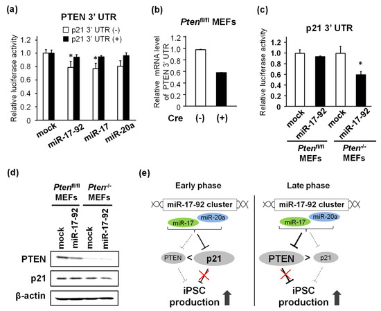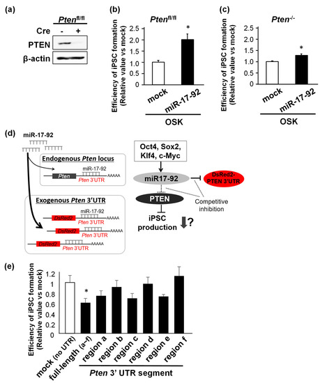 Next, we examined how PTEN affected the miR-17-92-mediated enhancement of mouse iPSC production. We used MEFs carrying a floxed Pten gene (Ptenfl/fl). Transduction with Cre recombinase converted the floxed allele into the knockout Pten gene and almost completely repressed PTEN protein expression in these MEFs (Figure 5a). The overexpression of miR-17-92 increased iPSC production efficiency in Pten−/− MEFs to a lesser extent than in Ptenfl/fl MEFs (Figure 5b,c). This suggests that PTEN is not the only miR-17-92-target affecting iPSC reprogramming efficiency. p21 is another target of miR-17-92 that inhibits iPSC reprogramming. We hypothesized that PTEN mRNA and other miR-17-92 targets, including p21 mRNA, may act as competing endogenous RNAs (ceRNAs), which are RNAs sharing miRNA recognition elements (MREs) with other RNAs (such as mRNA and long non-coding RNA), as common targets against the miRNA [20]. Depending on the miRNA affinity, variable post-transcriptional regulation of one or more genes may occur among all miRNA targets [20,21]. To examine the above hypothesis, we constructed lentiviral vectors expressing a DsRed coding region fused with each segment of the six consecutive regions (a–f) or the full-length PTEN 3′ UTR. Each of these regions contained various numbers of binding motifs for individual miRNAs comprising miR-17-92, such that the exogenous expression of these segments allowed for the competitive absorption of endogenous miRNAs that bind to the same motifs (Figure 5d). Accordingly, we overexpressed the full-length or a single segment of the PTEN 3′ UTR in MEFs co-infected with OSKM to examine the effects of these “miRNA sponges” on iPSC reprogramming efficiency. Maximum reduction in the Nanog-positive iPSC colony number was observed in cells treated with the full-length PTEN 3′ UTR (Figure 5e). iPSC production was also decreased in cells expressing regions a and e, to which miR-17 and miR-20a can bind (Figure 5e). Since both the PTEN 3′ UTR and p21 3′ UTR contain binding motifs for miR-17 and miR-20a, we speculated that these miRNAs were responsible for the miR-17-92-dependent enhancement of iPSC formation through PTEN/p21 inhibition.