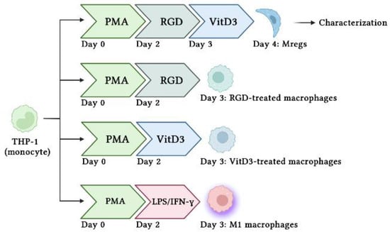 Figure 1 shows the protocol used to generate various human macrophage subtypes. Briefly, we incubated THP-1 cells with 10 ng/mL PMA for 48 h, then stimulated them with 100 ng/mL LPS and 100 ng/mL IFN-γ to generate M1 macrophages. The PMA-induced macrophages were incubated with 1 µg/mL RGD for 24 h, followed by 1 µM vitD3 for 24 h to generate Mregs. Cells were harvested using 5 mM EDTA on ice to avoid damage by detachment, as described [35] and characterized.