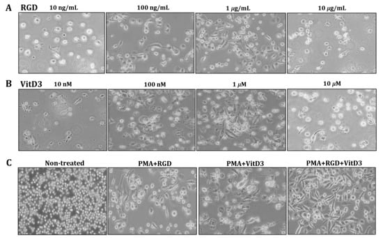 Incubation with PMA, RGD, and vitD3 induces THP-1 cell elongation. We incubated THP-1 cells with PMA (10 ng/mL) for 2 days, followed by various concentrations of RGD (A) or vitD3 (B) for 1 day. Cells were incubated with PMA (10 ng/mL) for 2 days, followed by RGD (1 μg/mL), then 1 μM vitD3 for 1 day (PMA + RGD + VitD3 group; (C) Cell morphology was visualized using an inverted microscope at 100× magnification.