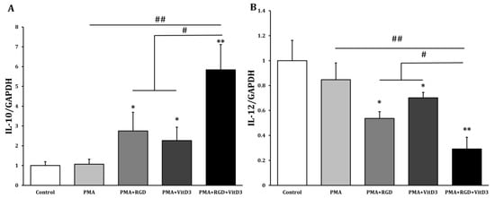 Incubation with PMA, RGD, and vitD3 upregulated IL-10 and downregulated IL-12 in THP-1 cells. We incubated THP-1 cells with 10 ng/mL PMA for 2 days, washed them with DPBS, then maintained them in RPMI-1640 media for 2 days (PMA group). Cells were incubated with PMA (10 ng/mL) for 2 days, followed by RGD (1 μg/mL; PMA + RGD) or vitD3 (1 μM; PMA + VitD3) for 1 day. Cells were washed with DPBS, then maintained in RPMI-1640 media for 1 day. We incubated cells with PMA (10 ng/mL) for 2 days, followed (sequentially) by RGD (1 μg/mL) for 1 day and vitD3 (1 μM) for 1 day (PMA + RGD + VitD3). Cells were harvested, and the mRNA expressions of anti-inflammatory IL-10 (A) and pro-inflammatory IL-12 (B) were quantified using qRT-PCR. * p < 0.05, ** p < 0.005 vs. controls incubated with DMSO; # p < 0.05, ## p < 0.005.