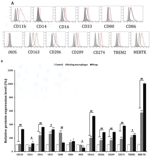 Phenotypic characterization of PMA/RGD/vitD3-induced Mregs-like cells. We generated resting macrophages by incubating THP-1 cells with PMA (10 ng/mL) for 2 days, washing them with DPBS, then maintaining them in RPMI-1640 media for 2 days (resting macrophages group). Cells were incubated with PMA (10 ng/mL) for 2 days, followed by RGD (1 μg/mL) for 1 day, then with vitD3 (1 μM) for 1 day to generate Mregs. Cells were harvested, and the expression of the cell surface and intracellular markers were assessed using flow cytometry. (A) Black lines, red lines, and gray shadows on representative flow cytometric histograms indicate resting macrophages, Mregs, and controls, respectively. (B) Bar graphs show the mean values of relative protein expression ± SD. * p < 0.05, ** p < 0.005 vs. DMSO controls. # p < 0.05, ## p < 0.005.