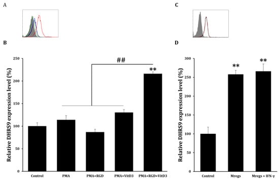 DHRS9 expression in Mregs. (A,B) cells were incubated with PMA (10 ng/mL) for 2 days, washed with DPBS, then maintained in RPMI-1640 media for 2 days (PMA group). Cells were incubated with PMA (10 ng/mL) for 2 days, followed by RGD (1 μg/mL; PMA+ RGD group) or vitD3 (1 μM; PMA + VitD3 group) for 1 day, washed with DPBS, then maintained in RPMI-1640 media for 1 day. Cells were incubated with PMA (10 ng/mL) for 2 days, followed by RGD (1 μg/mL) for 1 day, then 1 μM vitD3 for 1 day (PMA + RGD + VitD3). Cells were harvested and DHRS9 expression was quantified using flow cytometry. (A) Blue, green, black, and red lines in representative flow cytometric histograms indicate PMA, PMA + RGD, PMA + VitD3, and PMA + RGD + VitD3 (Mregs), respectively. Gray shadows indicate the control. (B) Bar graphs show the mean values of relative DHRS9 expression ± SD. (C,D) Mregs were incubated with IFN-γ (25 ng/mL) for 24 h, and DHRS9 expression was measured using flow cytometry. (C) Red and black lines in representative flow cytometric histograms indicate Mregs and Mregs + IFN-γ, respectively. Gray shadow indicates the control. (D) Bar graphs show the mean values of relative DHRS9 expression ± SD. ** p < 0.005 vs. DMSO controls; ## p < 0.005.