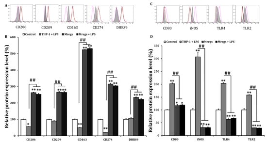 Marker expression of Mregs did not change upon exposure to LPS. (A–D) We generated Mregs as described in Figure 5. We stimulated THP-1 cells or Mregs with LPS (100 ng/mL) for 24 h, then quantified expression of cell surface markers using flow cytometry. For (A,C), the red and black lines are representative of the flow cytometric histograms for Mregs and Mregs + LPS, respectively. Pink lines and gray shadow indicate THP-1 + LPS and controls, respectively. For (B,D), Bar graphs show the mean values of relative protein expression ± SD. * p < 0.05, ** p < 0.005 vs. controls incubated with DMSO; ## p < 0.005.