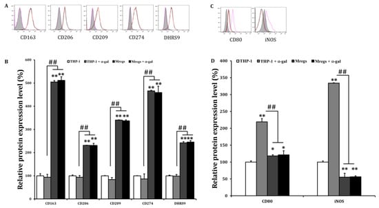 Marker expression of Mregs did not change upon exposure to xenogeneic antigen. (A–D) We generated Mregs as described in Figure 5. We stimulated THP-1 cells or Mregs with α-gal (100 ng/mL) for 24 h, then quantified the expression of cell surface markers using flow cytometry. (A,C) are the representative flow cytometric histograms, for which red and black lines indicate Mregs and Mregs + α-gal, respectively, while pink lines and gray shadow indicate THP-1 + α-gal and controls, respectively. (B,D) are the mean values of relative protein expression ± SD. * p < 0.05, ** p < 0.005 vs. controls incubated with DMSO; ## p < 0.005.