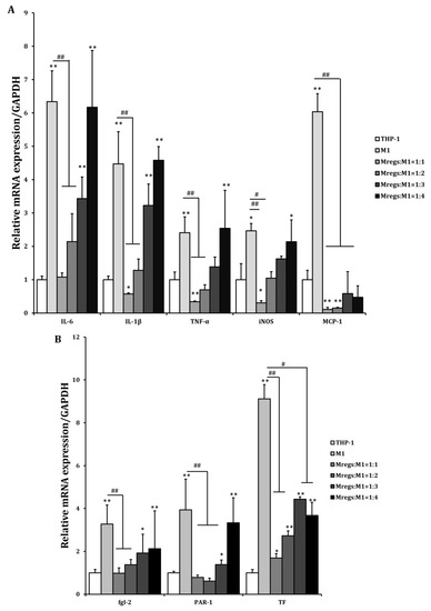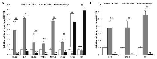 Regulatory macrophages suppressed mRNA expression of pro-inflammatory and coagulation-related genes in M1 and MPN3 cocultures, according to the ratios of Mregs and M1 cells. We generated M1 macrophages by incubating THP-1 cells with LPS (100 ng/mL) and IFN-γ (20 ng/mL) for 24 h, in order to generate Mregs as described in Figure 5. Thereafter, Mregs were cocultured them at indicated ratios for 1 day. Thereafter, THP-1, M1, or Mregs/M1 cocultures were incubated with MPN-3 cells for 2 h (fgl-2, and TF), 6 h (IDO, IL-1β, IL-6, IL-10, IL-12, iNOS, and TNF-α), or 12 h (PAR-1 and MCP-1). Cells were harvested and mRNA expression of cytokines and chemokines (A) and coagulation-related genes (B) were evaluated using qRT-PCR. * p < 0.05, ** p < 0.005 vs. MPN3 + THP-1; # p < 0.05, ## p < 0.005.