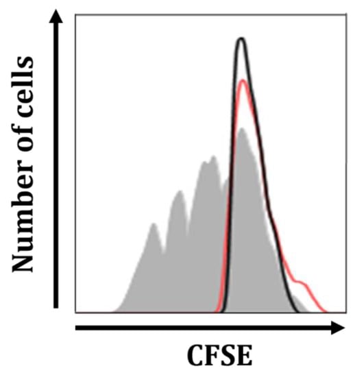 The suppression of mitogen-induced T cell proliferation is a distinct feature of Mregs [21]. Therefore, we investigated whether Mregs could suppress the mitogen-stimulated Jurkat T cell line. We cocultured Mregs with CFSE-labeled Jurkat T cells and incubated them with the T cell mitogen known as phytohemagglutinin (PHA). Figure 10 shows that T cells stimulated with PHA rapidly proliferated (gray shadow), whereas those stimulated with a 1:1 ratio of Mregs to T cells did not proliferate (red line). These results indicated that Mregs suppressed mitogen-induced T cell proliferation.
