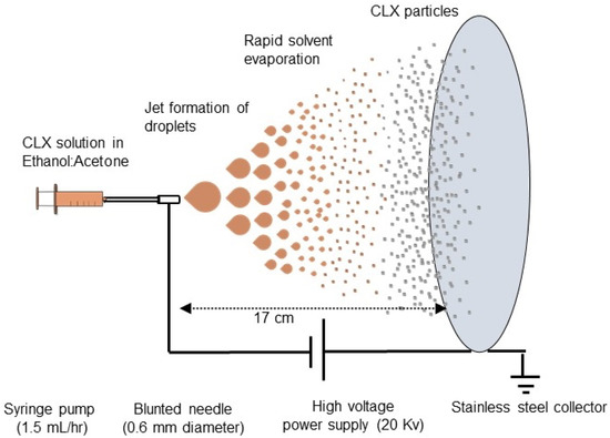 The electrospraying experimental setup contained a syringe pump (Fanavaran Nano-Meghyas Co., Mashhad, Iran), a stainless steel 23 G blunted needle (0.6 mm inner diameter), a high voltage generator (Fanavaran Nano-Meghyas Co., Mashhad, Iran), and a stainless-steel collector plate. The solvent system and feed concentrations were selected, based on our previous work on electrospraying of other drugs [10,33]. The selected solvent should be volatile, have sufficient electrical conductivity, and show good solvency for CLX. Based on these criteria, an ethanol-acetone (1:1) mixture was used to dissolve CLX. CLX was completely dissolved in the solvent system at room temperature to achieve 3% and 5% w/v concentrations, and it was stirred for 15 min at 200 rpm on a hot-plate stirrer (Heidolph MR Hei-Tec magnetic stirrer, Heidolph Co., Schwabach, Germany) at room temperature. Electrospraying of the prepared solution was conducted under the following conditions: feeding rate 1.5 mL/h, working voltage 20 kV, and tip-to-collector distance of 17 cm. These experimental conditions used were initially optimized by varying factors, such as the drug solution concentration under several electrospraying conditions. The prepared particles were removed from the collector plate and kept in a desiccator (to protect them from humidity) at room temperature (20–25 °C) until further analyses (Figure 1).