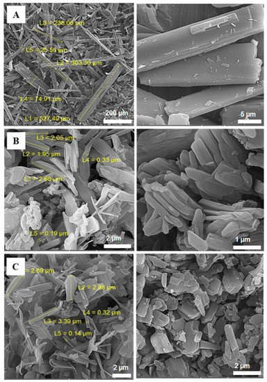 Aerosol performance is highly associated with the size and shape of the prepared particles. Accordingly, these properties should be carefully modulated when designing DPI formulations [39]. SEM micrographs of the untreated CLX and the prepared particles (electrosprayed solutions containing 3% and 5% w/v CLX) are shown in Figure 2. In general, the size of the particles formed is greatly dependent on the concentration of the electrosprayed solution [38]. For instance, when the concentration of CLX in electrosprayed solutions increased from 3 to 5%, the particle size became larger. The SEM micrographs presented that the size and morphology of the CLX powder were changed during the electrospraying process (Figure 2). Unlike untreated CLX powder, which exhibited needle-like crystals with lengths ranging from 25 to 527 µm (Figure 2A), the electrosprayed samples displayed a smaller size range (about 3 µm) with different morphological appearance. The SEM images revealed that the concentration of CLX used during the electrospraying process has an impact on the morphology of the obtained particles. For instance, when the concentration of CLX was 3%, most of the obtained particles were rod-like in shape (Figure 2B), whereas, in the case of the 5% CLX, the produced particles had irregular plate-like morphology (Figure 2C).