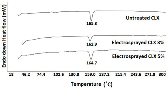 The thermal behavior of untreated CLX, as well as CLX particles obtained from the electrospraying of 3% and 5% CLX solutions, are illustrated in Figure 3. The DSC traces of untreated CLX particles obtained from electrosprayed solutions of CLX (3% and 5 % w/v) showed an endothermic peak at 165.3, 162.9, and 164.7 °C, respectively. As can be seen, the melting points of the electrosprayed samples were similar to those of untreated CLX (as in previous studies) [40].