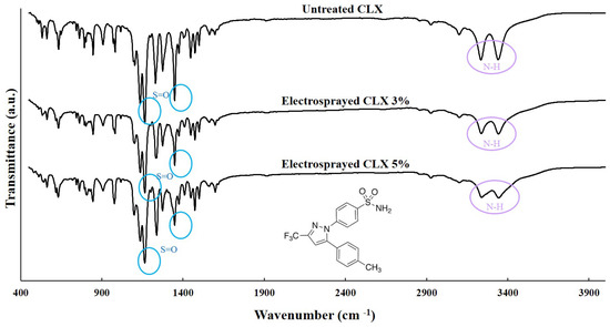FTIR spectroscopy was applied for the assessment of potential structural changes in CLX following the electrospraying process. The FTIR spectrum of untreated CLX was compared with that of the electrosprayed CLX samples (Figure 4). The observed characteristic peaks of untreated CLX at 1163 and 1350 cm−1 were attributed to S=O symmetric and asymmetric stretching, respectively. Medium intensity bands at 3338 and 3242 cm−1 were seen as a doublet, which is assigned to the N–H stretching vibration of the –SO2 NH2 groups [41,42]. As shown in Figure 4, no visible shift in peaks was observed in the FTIR spectra of the prepared samples compared to that of the untreated CLX. This indicates that there was no change in the chemical and crystal structure of the prepared drug formulations after preparation through the electrospraying process.