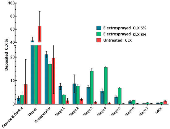 Figure 5. In vitro deposition of untreated CLX, as well as electrosprayed CLX particles obtained from 3 and 5% w/v CLX solutions.