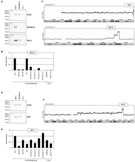 RT-PCR and RQ-PCR analyses confirmed MYC expression in SC-1, which was, however, just slightly increased (Figure 2D,E). Nevertheless, copy number data for SC-1 also showed amplification of the MYC gene (Figure 2F), corresponding to the situation at BCL2. These similarities may underlie subsequent events of a three-way translocation.