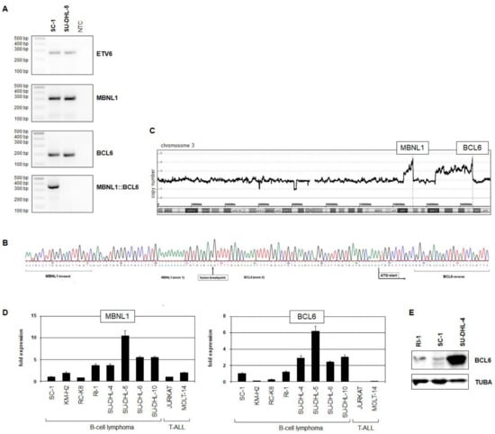 Analysis of MBNL1::BCL6 rearrangement. (A) RT-PCR analysis of MBNL1, BCL6, and MBNL1::BCL6. ETV6 served as positive control. (B) Sequencing result of fusion gene MBNL1::BCL6 in SC-1. Fusion breakpoint and ATG start are indicated. (C) Copy number analysis for SC-1 of chromosome 3. The position of the genes MBNL1 and BCL6 are indicated. (D) RQ-PCR analysis of MBNL1 and BCL6 in SC-1 and control cell lines. (E) Western blot analysis of BCL6. TUBA served as loading control.