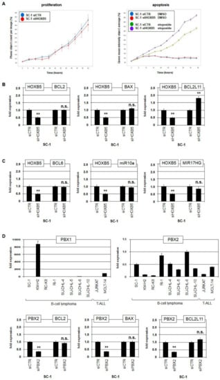 Functional analysis of HOXB5. (A) Live-cell imaging analysis of SC-1 cells treated for knockdown of HOXB5 (left) and additionally with 100 µM etoposide dissolved in DMSO (right). Phase object count represents the cells corresponding to proliferation (left). Green intensity represents dying cells corresponding to the number of apoptotic cells (right). (B,C) RQ-PCR analysis of six target gene candidates in SC-1 cells treated for knockdown of HOXB5. (D) RQ-PCR analysis of SC-1 and control cell lines for PBX1 (left) and PBX2 (right). RQ-PCR analysis of SC-1 cells treated for knockdown of PBX2 (below). Statistical significance was assessed by Student’s t-test, and the calculated p-values were indicated by asterisks (** p < 0.01, n.s.—not significant).