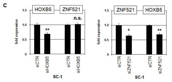 HOXB5 reportedly plays a basic role in early hematopoietic cell differentiation, while aberrant expression suppressed B-cell differentiation [27,28]. Comparative gene expression profiling analysis of SC-1 versus seven B-cell lymphoma control cell lines demonstrated elevated HOXB5 activity and revealed high expression levels of ZNF521 in SC-1 (Supplementary Table S1). The RQ-PCR analysis of ZNF521 in cell lines confirmed enhanced expression levels in SC-1 (Figure 6A). Furthermore, SC-1 expressed significant levels of ZNF521 as compared to HSCs (Figure 6A). This zinc-finger transcription factor plays a role in hematopoietic progenitors and is associated with pre-B-ALL [29,30]. Public RNA-seq data from hematopoietic stem cells and lymphoid progenitor cells and gene expression profiling data from myeloid progenitors showed elevated co-expression of ZNF521 and HOXB5 in early stages (Figure 6B and Figure S7), supporting their described role in stem and progenitor cell differentiation and indicating mutual regulation. SiRNA-mediated knockdown experiments demonstrated that ZNF521 activated HOXB5 expression without reciprocal action (Figure 6C). Thus, both HOXB5 and ZNF521 are active in hematopoietic stem and progenitor cells and exhibit regulatory connections. These data support the conclusion that aberrant HOXB5 expression may deregulate differentiation processes in B-cell lymphoma.
