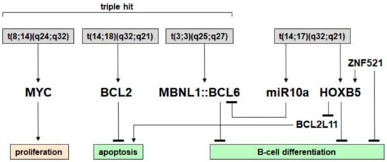 The oncogenes BCL2, BCL6 and MYC are of special interest and drive deregulation of basic cellular processes including apoptosis, differentiation and proliferation [3,4,5]. Rearrangements of BCL2 and MYC mostly juxtapose immunoglobulin genes (IG), while those of BCL6 usually generate fusion genes with various partners [1,4]. BCL2, MYC, and/or BCL6 are simultaneously rearranged in so-called double-hit and triple-hit lymphomas, respectively [6]. These tumor types have been grouped as high-grade B-cell lymphoma and are associated with poor prognosis, requiring special treatments [2,7,8]. Additional gene mutations and copy number alterations are frequently observed, and their investigation may assist in understanding lymphomagenesis and improving therapy [6,9,10].