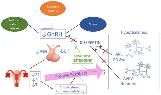 Psychosocial and metabolic factors, such as reduced caloric intake, excessive exercise and stress, impair hypothalamic secretion of GnRH, leading to an abnormal pituitary production of gonadotropins and to anovulation and hypoestrogenism. The chronic lack of steroid hormone production inhibits the positive feedback usually exerted by estrogen levels on KNDys and AVPV neurons, blocking ovarian function. Low-dose estrogens may induce a central positive feedback acting primarily on AVPV neurons modulating kisspeptin production and consequently stimulating GnRH pituitary secretion. E2—estradiol; P—progesterone; T—testosterone; KNDys—Kisspeptin, neurokinin B, and dynorphin (KNDy) neurons; AVPV—anteroventral periventricular nucleus; ARC—arcuate nucleus.
