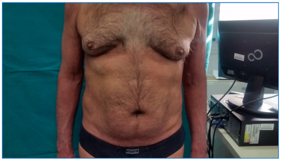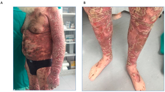 Physical examination showed extensive infiltrated erythematous-squamous plaques spread over the entire skin area, with marked involvement of the limbs, as reported in Figure 1A,B.