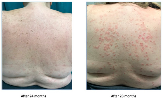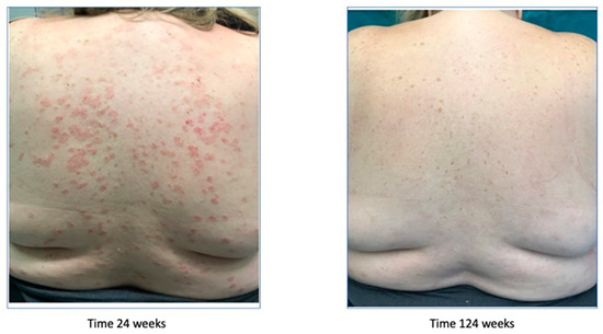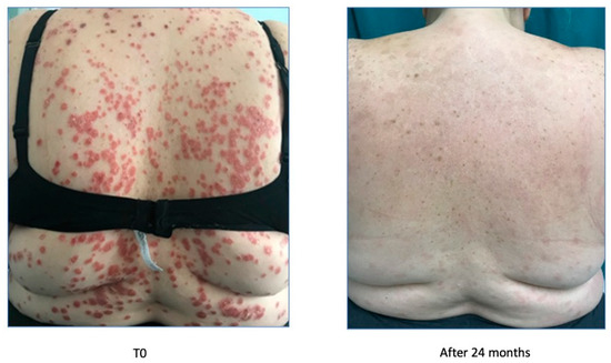After 12 weeks, before the third administration of the drug, complete resolution of the clinical picture was observed, with a PASI 0 and a DLQI 0. The long-term effects are still appreciable, as reported in Figure 11.