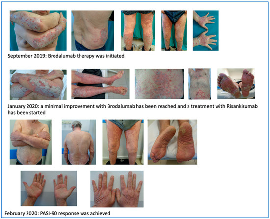 Before starting the treatment with risankizumab, the patient experienced numerous treatment failures with acitretin (several cycles in monotherapy from 2009 to 2012, and subsequently in combination with biological therapy), etanercept (from December 2012 to June 2015, adalimumab (June 2015 to October 2015), ustekinumab (from October 2015 to July 2016), secukinumab (July 2016 to January 2018), and ixekizumab (January 2018 to July 2020).
