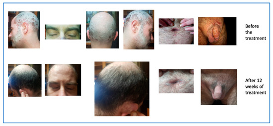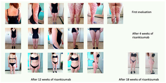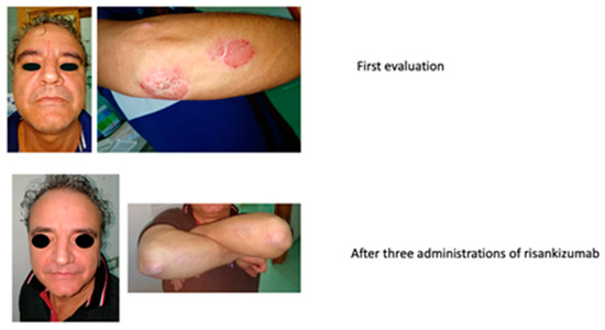 In September 2019, the patient started the treatment with risankizumab (150 mg s.c.). In January 2020, after three administrations, the clinical scenario was almost solved, with a PASI 2.2, BSA 6%, and DLQI 6. The improvement can be seen in Figure 14.