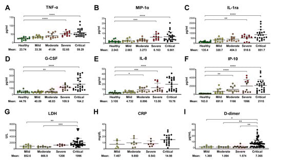Elevated plasma levels of inflammatory markers (including tumor necrosis factor-alpha (TNF-α), macrophage inflammatory protein-1 alpha (MIP-1α), interleukin 8 (IL-8), interferon-gamma-induced protein 10 (IP-10), and others) have been reliably associated with more severe disease and serious symptoms including alveolar–capillary barrier disruption and intra-alveolar hemorrhage [58,59,60,61]. Based on these reports, we first sought to correlate disease severity with plasma biomolecules using the Bio-Plex Pro Human Cytokine 27-plex Assay (Bio-Rad). Interestingly, the plasma levels of ten signaling molecules (TNF-α, MIP-1α, interleukin-1 receptor antagonist (IL-1ra), granulocyte colony-stimulating factor (G-CSF), IL-8, IP-10, interferon-gamma (IFN-γ), monocyte chemoattractant protein-1 (MCP-1), platelet-derived growth factor (PDGF), and vascular endothelial growth factor (VEGF)) were found to be significantly elevated in patient samples compared to healthy controls, but only six (TNF-α, MIP-1α, IL-1ra, G-CSF, IL-8, and IP-10) showed a gradually rising trend of mean values in correlation with disease severity (Figure 1A–F). Remarkably, none of them were found to be significantly elevated in the mild plasma group compared to samples of healthy individuals, and four of them (TNF-α, MIP-1α, IL-1ra, and G-CSF) only showed a significant increase in severe and critical samples (Figure 1A–D). IL-8 and IP-10 demonstrated the most consistent correlation with disease severity, presenting significantly increased levels in moderate, severe, as well as critical samples (Figure 1E,F). Additionally, elevated expression levels of MCP-1, PDGF, VEGF, and IFN-γ exhibited only a partial correlation with disease severity.