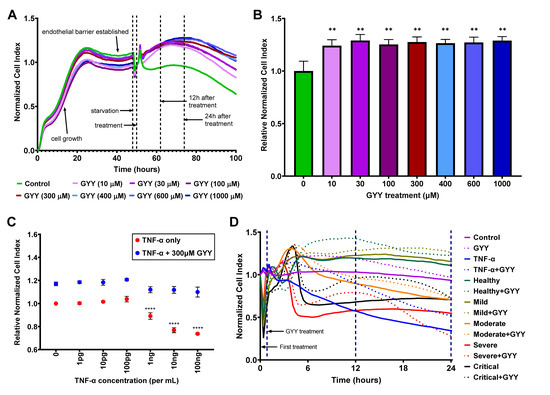 An electrical impedance assay was adapted from the manufacturer’s protocol using the xCELLigence Real-Time Cell Analysis system (Agilent, Santa Clara, CA, USA). HLMVECs were seeded in a precoated 96-well cell culture plate equipped with gold electrodes (E-plate; Agilent, Santa Clara, CA, USA) at a density of 14,000 cells per well, predefined by previous experiments [56,57]. Cells were incubated under growth conditions for 48 h to form a confluent monolayer (indicated by a plateau of electrical impedance). The growth medium was then replaced by a prewarmed starvation medium containing 1% BSA and no growth supplements for 2 h before starting the treatment protocol. TNF-α and GYY4137 working solutions were prepared in starvation medium. For vehicle control of TNF-α and GYY4137 treatment, starvation medium was used. As controls for plasma treatment and virus challenge, growth medium and matching virus-free medium (respectively) were used. First, the HLMVEC monolayer was treated with human plasma, TNF-α, inactivated SARS-CoV-2 virus, or vehicle control. Thirty minutes later, GYY4137 or vehicle control was added to the wells, and the E-plates were further incubated in a 5% CO2 atmosphere at 37 °C for 24 h. All treatments were carried out in starvation medium, and each treatment group had 3–6 replicates on each plate. Plasma samples and inactivated virus stocks were used at 1:10 dilution (virus stock working concentration: 5 × 104 PFU per each 200 µL reaction, 250 PFU/µL) with matching vehicle controls. TNF-α and GYY4137 were used at 10 ng/mL and 300 µM, respectively, unless otherwise indicated. Electrical impedance for each well was recorded as Cell Index (CI) every 10 min in real time throughout this process. CI readings were normalized (Normalized Cell Index, NCI) to the last recorded CI value before the first treatment to minimize well-to-well noise resulting from pretreatment differences (seeding, electrode sensitivity, etc.). During data analysis, NCI values were further normalized (Relative Normalized Cell Index, RNCI) to the negative control (treated with vehicle control only; control) readings from the same E-plate to account for plate-to-plate variability. Unless otherwise indicated, measurements at 12 h after treatment were analyzed and plotted.