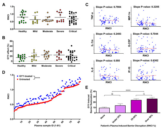 The recent literature demonstrated various levels of correlation between endothelial barrier disruption and the plasma cytokine levels and/or disease severity of patients with different pathological conditions, including COVID-19 [59,69,70]. Surprisingly, when we compared the effect of plasma from different disease severity groups on the RNCI of the HLMVEC monolayer, we found no statistical differences at 12 (Figure 3A) or 24 h, suggesting that our model was equally responding to samples from healthy individuals and COVID-19 patients. Similarly, when we calculated the barrier-altering effect of GYY4137 treatment after plasma treatment, we only detected a slightly increasing trend towards the more severe disease groups, but this trend did not reach the level of statistical difference (Figure 3B). Moreover, none of the biomolecules that showed a strong correlation with disease severity in experiments described earlier (Figure 1A–F) presented correlation with the RNCI after plasma treatment (Figure 3C). In fact, when we matched the barrier-disrupting effect of each plasma sample with its cytokine/chemokine profile, none of the inflammatory signaling molecules assessed in this study correlated with the corresponding RNCI values. Altogether, our results suggest that the change in endothelial barrier permeability in our model is neither linked to COVID-19 disease severity nor the individual plasma concentration of any of the inflammatory markers analyzed.