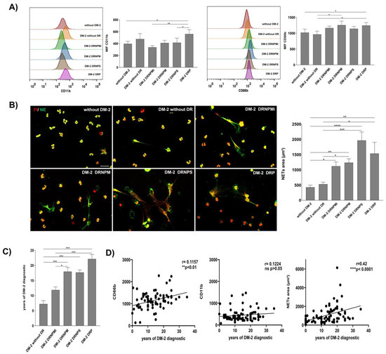 The development of DR is associated with permanent chronic inflammation caused by hyperglycemia and oxidative stress [5]. Neutrophils are inflammatory cells that are activated in the presence of microbial compounds, cytokines, and chemokines, among other inflammatory stimuli [6,7]. Activated neutrophils are defined as cells with a high expression of CD11b and CD66b and are able to perform inflammatory mechanisms such as degranulation, chemiotactic migration, and the release of neutrophil extracellular traps (NETs), among others [8,9]. NETs are structures formed by extracellular DNA decorated with proteolytic enzymes and modified proteins that are associated with the exacerbation of tissue damage in many pathologies such as sepsis [10], thrombosis [11], and autoimmune diseases such as systemic erythematosus lupus, rheumatoid arthritis, and psoriasis [12,13,14]. Thus, NETs are involved in inflammatory processes such as chronic obstructive pulmonary disease (COPD), cardiovascular risk, or risk of mortality in cancer [15,16,17].