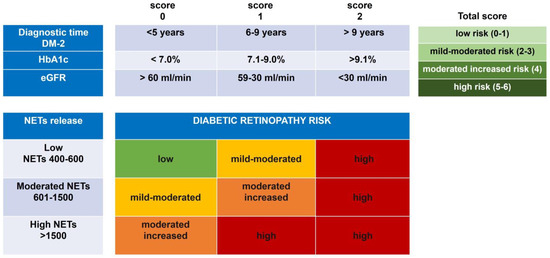 As we have shown, NETs are associated with eGFR, HbA1c, and the diagnostic time of T2DM, and are differentially released in DR subjects. The associated risk of development of DR was calculated considering these clinical variables and the grade of NETs. A risk matrix was designed to categorize the three clinical risk variables: the diagnostic time of T2DM, the percentage of HbA1c, and the calculated eGFR, and were assigned a score at these categories (Figure 3). According to the risk matrix, a total score was obtained from these three variables, and four levels of risk were established as follows: low (0–1), mild–moderate (2–3), moderate–increased (4), and high (5–6) (Figure 3). These data indicate that the higher risk of development of DR is related to poor glycemic control, levels of HbA1c > 9%, and eGFR values < 30 mL/min, in addition to a long time of T2DM > 9 years of diagnosis. On the other hand, the lower risk of DR development was associated with acceptable glycemic control, levels of HbA1c < 7%, eGFR values > 60 mL/min, and a DM-2 evolution of less than five years (Figure 3).