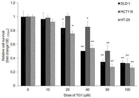 TG1 exhibited cytotoxicity in colorectal cancer cells. After treatment with TG1 at different doses (0 to 100 μM), the relative cell survival rate was determined through the SRB colorimetric assay. TG1 resulted in reduced cell survival in DLD-1, HCT116, and HT-29 cells in a dose-dependent manner compared with the survival of the control-treated cells (* p < 0.05, ** p < 0.01).