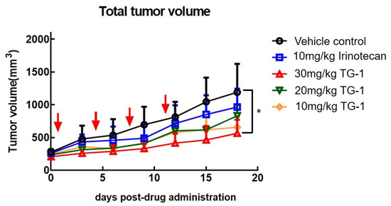 Inhibition of tumor progression by TG1 and irinotecan in xenograft model. Growth of tumor volume was inhibited effectively by TG1, while dose-dependent inhibitory effects of TG1 were demonstrated. Arrows indicate time points when drugs were administered. In addition, the inhibitory effect of TG1 was better than that of irinotecan, which is a common chemotherapeutic agent in clinical use. * p < 0.05.