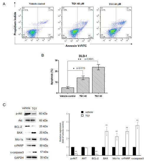 Treatment with TG1 induced apoptosis in colorectal cancer cells. DLD-1 cell apoptosis was analyzed using Annexin V-FITC/propidium iodide staining and FACS analysis after being treated with 40 and 60 μM TG1 (A,B). Protein levels of apoptosis-related genes were determined by Western blotting (C). DLD-1 cells treated with 60 μM TG1 exhibited increased levels of BAX, Mcl-1s, c-PARP, and c-caspase 3, whereas levels of p-Akt and BCL-2 were decreased. All experiments were performed at least three times independently (* p < 0.05, ** p < 0.01).