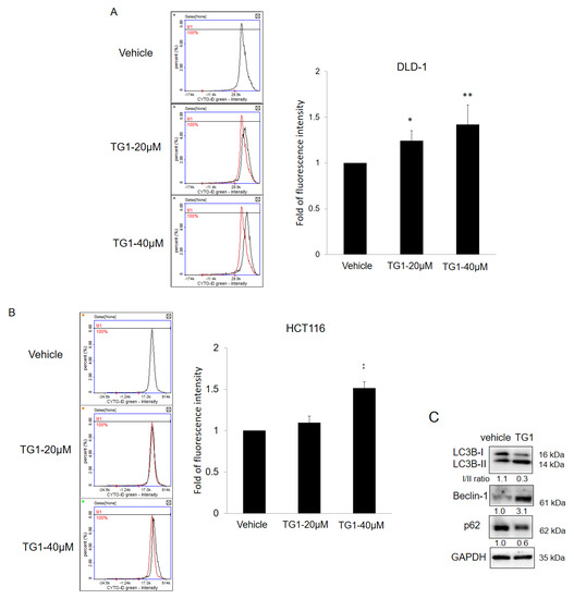 Treatment with TG1 induced autophagy in colorectal cancer cells. DLD-1 and HCT116 cells were treated with TG1 at 20 μM and 40 μM for 48 h, and autophagic vacuoles and autophagic flux were detected using a Cyto-ID Autophagy Detection Kit, which demonstrated autophagy was increased after the treatment (A,B). Relative levels of autophagy-related proteins were obtained via Western blot analysis, which showed autophagy was induced after treatment with TG1 (C) (* p < 0.05, ** p < 0.01).