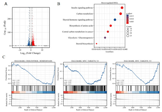 Pathway enrichment analysis of colorectal cancer cells treated with TG1. (A) Identification of DEGs between TG1 treatment and control group based on RNA-sequencing data. Volcano plot displaying the significant 1837 upregulated DEGs (red) and 1437 downregulated DEGs (blue). (B) KEGG pathway enrichment analysis of downregulated DEGs between control and TG1 treated group from RNA-seq data. Bubble plot showing seven metabolic associated pathways (p-value < 0.05, q-value < 0.25). (C) GSEA analysis based on the log2 fold changes of protein-coding genes between control and TG1 treated group.