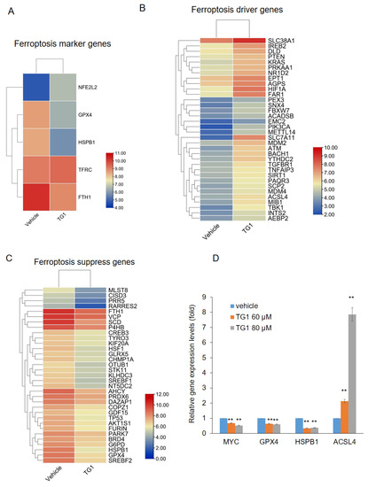 Differentially expressed ferroptosis-related genes between the control group and the TG1 treatment group. (A) Five marker genes of ferroptosis-related genes. (B) 34 driver genes of ferroptosis-related genes. (C) 33 suppressor genes of ferroptosis-related genes. (D) The expression of MYC, GPX4, HSPB1, and ACSL4 was validated through RT-qPCR analysis (** p < 0.01).