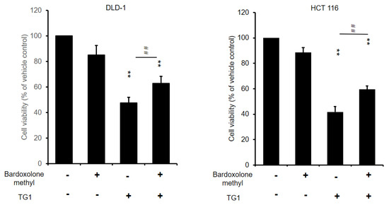 In order to explore the role of ferroptosis in the cytotoxicity of TG1 on CRC cells, a ferroptosis inhibitor, bardoxolone, was used in combination with TG1. Bardoxolone methyl is known to inhibit ferroptosis without exhibiting any antioxidant activity [33]. To investigate the regulation of ferroptosis in TG1-induced cancer cell cytotoxicity, DLD-1 and HCT116 cells were treated with bardoxolone in combination with TG1 at concentrations of 40 and 60 μM. Treatment with bardoxolone alone did not affect the viability of DLD-1 cells, but co-treatment with bardoxolone rescued the TG1-induced cytotoxicity (Figure 7). Similarly, bardoxolone treatment consistently exhibited a rescue effect on TG1-induced cancer cell death in HCT116 cells (Figure 7). These findings suggest that the cytotoxic effect of TG1 on CRC cells is mainly regulated by ferroptosis.